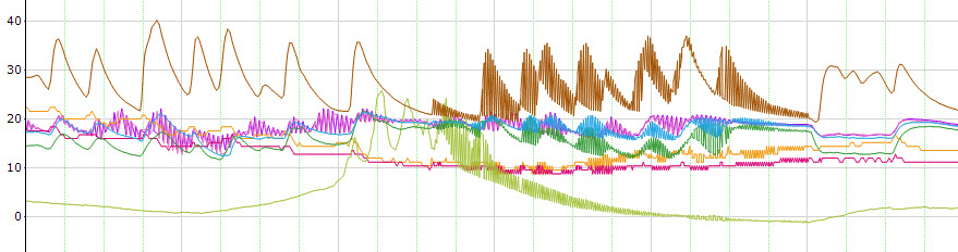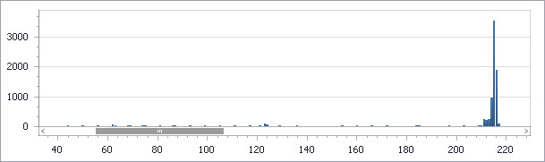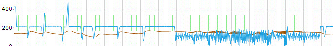 Здесь голубой линией показаны отличия между соседними выборками. Уровень 215 секунд это наиболее вероятное время между выборками, что и видно на гистограмме.
