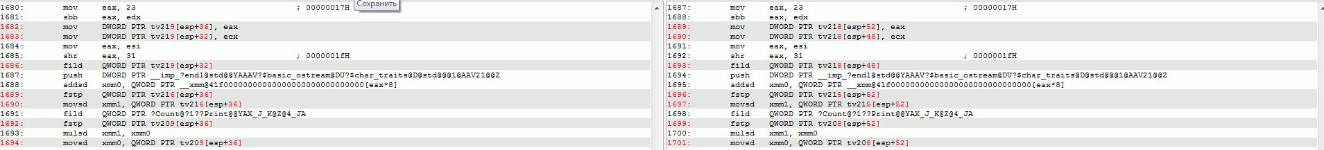 К>Попробуй сравнить дизасмы программ со строчкой и без неё. Скорее всего, у оптимизатора крыша поехала.