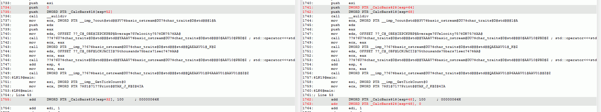 G>>А замедление в два раза после добавления безобидной строчки cout перед циклом (без обращения к CalcBars) — это вообще безобразие.