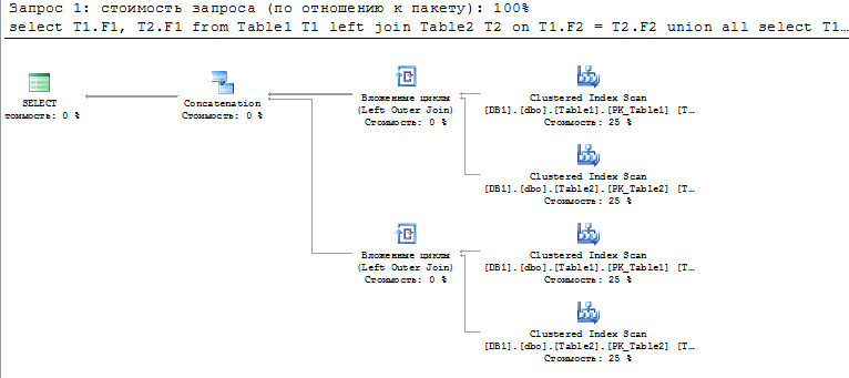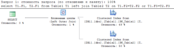 здесь тоже возможны сканы таблиц, но по крайней мере без NL-ов. Время выполнения запроса под mssql ~1 сек. Для таблиц созданы кластерные индексы по F1 и простые не составные индексы по F2 и F3. План: