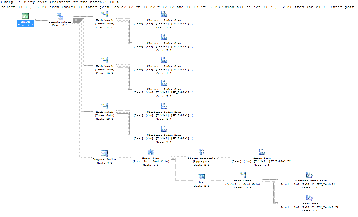 здесь тоже возможны сканы таблиц, но по крайней мере без NL-ов. Время выполнения запроса под mssql ~1 сек. Для таблиц созданы кластерные индексы по F1 и простые не составные индексы по F2 и F3. План: