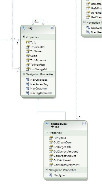 В БД (MS SQL 2008 R2) имеется некий "интерфейсный" слой — набор вьюшек и хранимых процедур, к которым имеет доступ наше приложение. В нашем приложении мы строим модель на базе EF 4.1, которая использует вьюхи из БД. В этой модели есть 2 сущности, для которых реализовано наследование — базовая сущность Tag и дочерняя сущность FinancialGoal. На реляционном уровне — это 2 таблицы с отношением 1 к 1, на уровне вьюх также используется общий ключ TtrId. Согласно инструкциям от MS мы создали одну сущность на базе вьюхи vwTags, потом создали наследуемую сущность на базе второй вьюхи vwGoals, удалили из набора полей сущности FinancialGoal поле TtrId и поставили в маппинге сущности FinancialGoal ключ TtrId базовой сущности Tag. Далее мы замапили соответствующие процедуры на вставку\обновление\удаление сущностей Tag и FinancialGoal. При этом сущность Tag НЕ является абстрактной и весьма автономна. Как родительская, так и дочерняя сущность имеют связи с другими сущностями модели. Поле TtrId у сущности Tag имеет свойство StoreGeneratedPattern=Identity. Все работает хорошо за исключением момента, когда мы пытаемся добавить сущность FinancialGoal. В этом случае возникает ошибка "A dependent property in a ReferentialConstraint is mapped to a store-generated column. Column: 'TtrId'.". Текст ошибки понятен — нам говорят о том, что в ссылочной зависимости внешний ключ является "store-generated column" и им является поле TtrId. Проблема в том, что нигде в модели нет этого внешнего ключа TtrId со свойством "store-generated column". В сущности Tag поле TtrId обладает таким свойством, но оно есть primary key и не является foreign key ни для одной из сущностей. Многочасовое ковыряние в edmx-е результатов не дало.. гугление тоже