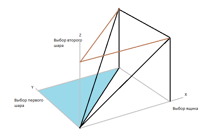 В плоскости XY белый треугольник — выбор ящика и белого шара (синяя часть — выбор черного шара).