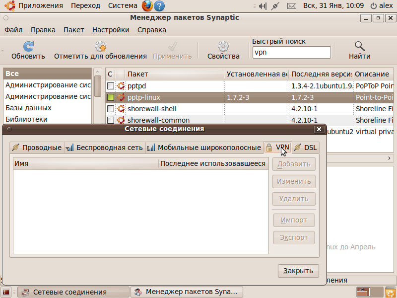 LS>Сначала надо поставить network-manager-pptp, "в коробку" его не кладут почему-то.