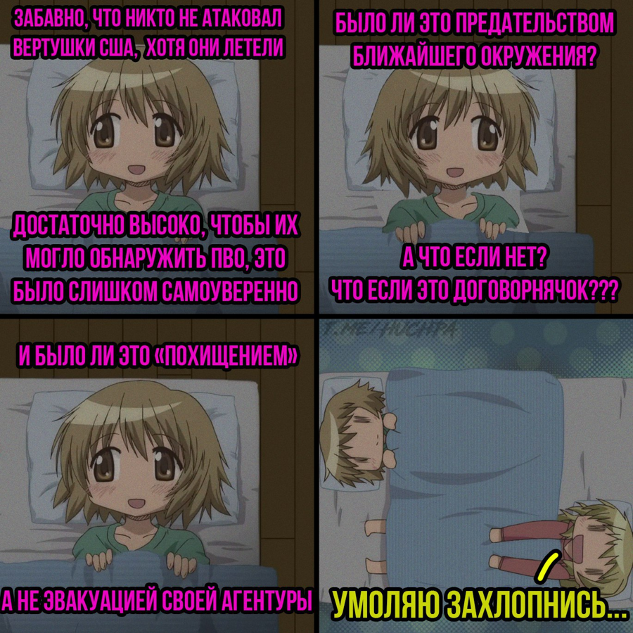 A>>ПЗРК-то остались — самое то для вертолётов на сверхмалой. Но похоже, мы увидели договонячок: либо Мадуро сдали, либо он сдался сам под некие гарантии, а Трамп получил маленькую победоносную войну. (Которая никогда бы не началась, если б он был президентом.) Ф>Ну хз, без военной связи сложновато определить кто там летает, и надо ли в них стрелять, особенно в 2 часа ночи.