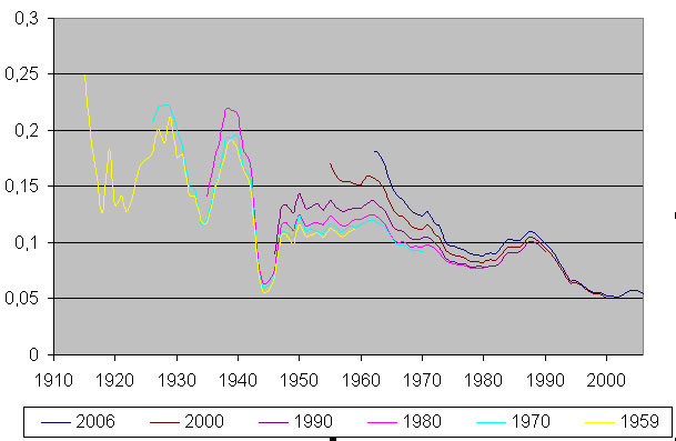 A>На этом графике, благодаря его относительности, все события 20 века видны гораздо лучше, чем на обычной половозрастной диаграмме. Провалы гражданской войны и 35 года видны очень четко. Вторая мировая оставила более глубокий след. Затем следует плавный подъем рождаемости до примерно 65 года — благодаря относительности диаграммы здесь наблюдается не провал, а даже небольшой подъем. Затем рождаемость начинает снижаться, но не непрерывно, а примерно до 1980 года, после чего опять начинается подъем