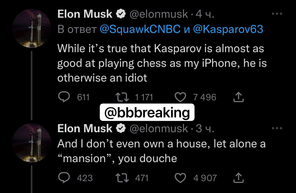 На упрек шахматиста Гарри Каспарова, что "кто-то, сидя в комфорте своих особняков в Силиконовой долине, рассказывает Украине, как вести свои собственные дела", Илон Маск ответил: «Это правда, что Каспаров почти так же хорошо играет в шахматы, как мой iPhone, в остальном он идиот. А у меня даже дома нет, не говоря уже о “особняке”, придурок», написал Маск в Твиттер.