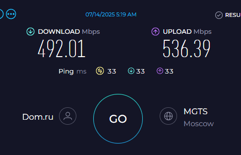 Пользуюсь уже 3 недели. Средняя скорость загрузки — около 300 Мбит/с, отправки — 30 Мбит/с, пинг — 25–35 мс.