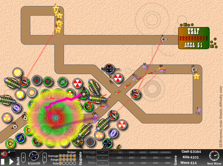 V>>Там такая дорожка от одного места к другому, с одного конца выезжают какие-то вредители (танчики чтоли), а тебе надо расставлять на их пути пушки чтобы их мочить. Пушки можно прокачивать, но и танчики становятся все сильнее со временем. Как доедут до конца — ты проиграл.