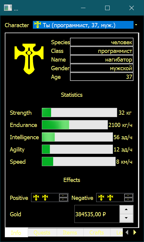 Симулятор алкоголика отличная идея на мой взгляд. Да бухнуть где-то это Quests, а бутылка водки пойдёт в Items. А собутыльники вверху в разворачивающемся списке, чтобы сменить свою информацию на них.