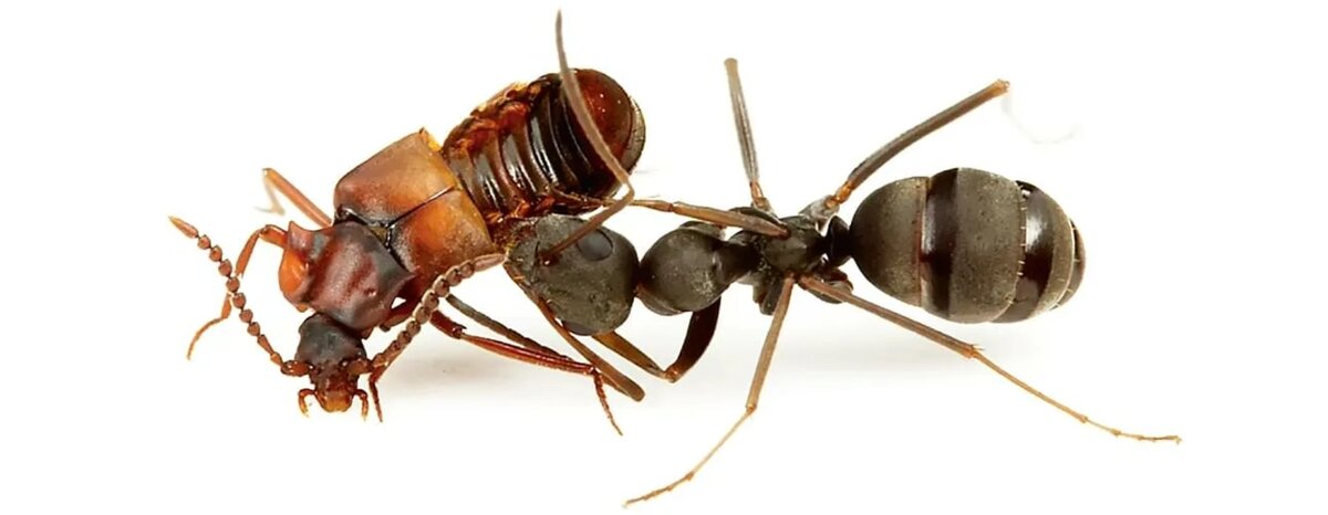 Муравей лижет волшебный нектар у ломехузы между ног: