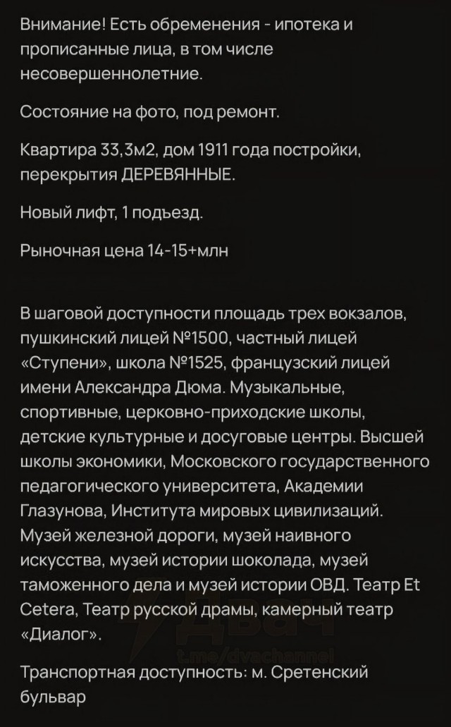 V>И вот я спрошу зачем весь этот гемор и сверх риски, когда можно за те же 12 млн. рублей найти площадь 33.3м². А риелтору, который скажет, что это стоит 14-15 млн. рублей я рассмеюсь в лицо. Нет риелтор, ищи дурачков дальше. За 14-15 млн. рублей с учётом подорожания нужно искать квартиру с полным косметическим ремонтом в нормальном доме пусть даже и рядом с МКАДом, а не это говнище непонятно кому принадлежащее и находящееся под угрозой разрушения.