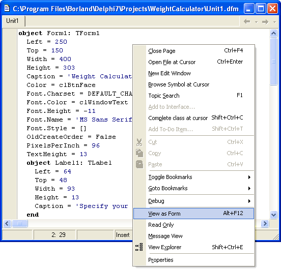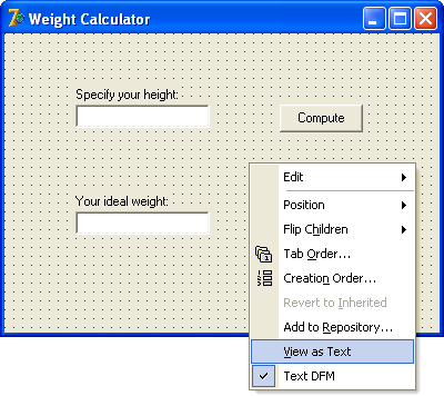 Если вы желаете взглянуть на содержимое DFM-файла, вызовите у формы контекстное меню щелчком правой кнопки мыши и выберите команду View as Text (рисунок 7.2).