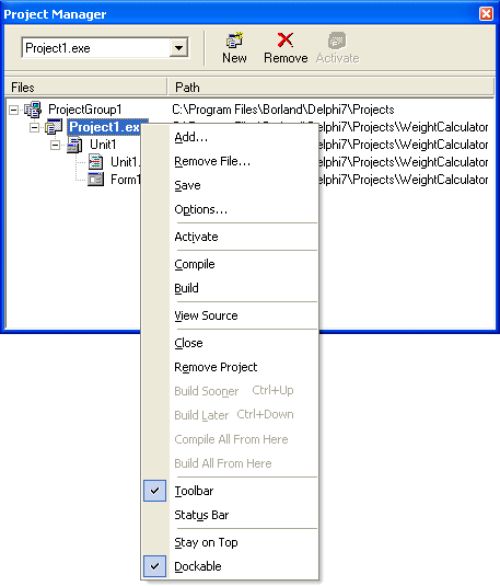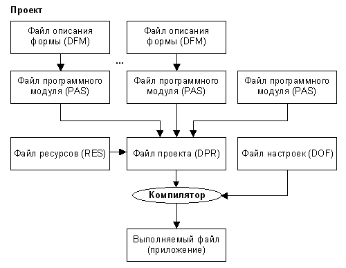 Приложение собирается из многих элементов: форм, программных модулей, внешних библиотек, картинок, пиктограмм и др. Каждый элемент размещается в отдельном файле и имеет строго определенное назначение. Набор всех файлов, необходимых для создания приложения, называется проектом. Компилятор последовательно обрабатывает файлы проекта и строит из них выполняемый файл. Основные файлы проекта можно разделить на несколько типов: