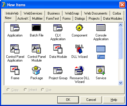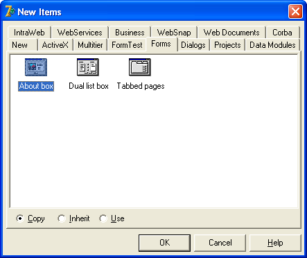 На вкладках Forms и Dialogs существует переключатель, указывающий, что нужно сделать с формой-заготовкой: копировать (Copy), наследовать (Inherit) или использовать (Use). Отличие между ними состоит в следующем: