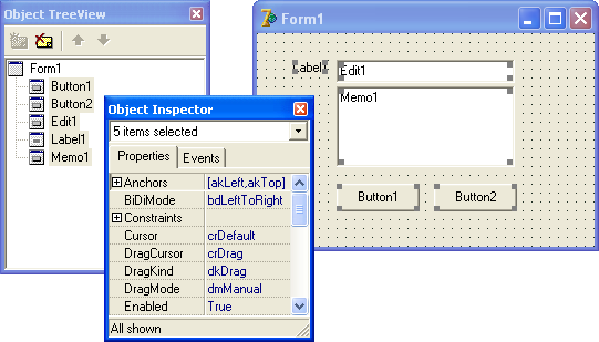 При проектировании сложных форм вы столкнетесь с ситуацией, когда сразу в нескольких компонентах нужно установить некоторое свойство в одно и то же значение. Например, в нескольких кнопках установить свойство Enabled в значение False. Быстрее всего это можно сделать, если выделить несколько компонентов, после чего перейти к окну свойств и изменить нужное свойство. Когда на форме выделено несколько компонентов, в окне свойств видны только их общие свойства.