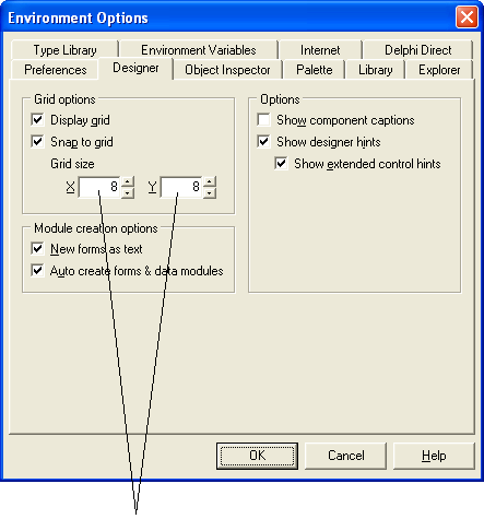 Чтобы упростить вам позиционирование и изменение размеров компонентов, форма отображает на этапе разработки сетку (grid). Компоненты автоматически выравниваются на пересечении воображаемых линий сетки, когда вы переносите их из палитры компонентов на форму. Изначально шаг между горизонтальными и вертикальными линиями сетки равен 8, но его легко изменить. Для этого выполните команду меню Tools | Environment Options... . На экране появится диалоговый блок Environment Options. Отыщите поля Grid size X и Grid size Y на вкладке Designer и установите те параметры сетки, которые вам нужны (рисунок 7.42). Кстати, с помощью соседних переключателей можно указать среде Delphi, следует ли вообще показывать сетку (Display grid) и следует ли выравнивать по ней компоненты (Snap to grid).