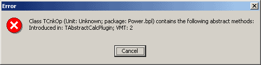Из этого сообщения сразу видно, что виноват класс TCnkOp, содержащийся в пакете Power.bpl. В нем не переопределен один абстрактный метод, декларированный в классе TAbstractCalcPlugin. Этот метод был декларирован третьим (нумерация слотов у нас начинается с нуля). От моего представления об идеале это сообщение отличает только отсутствие ссылки на строку исходного файла, в которой был задекларирован данный метод, и имени метода. Увы, в Delphi вплоть до седьмой версии такую информацию получить невозможно.