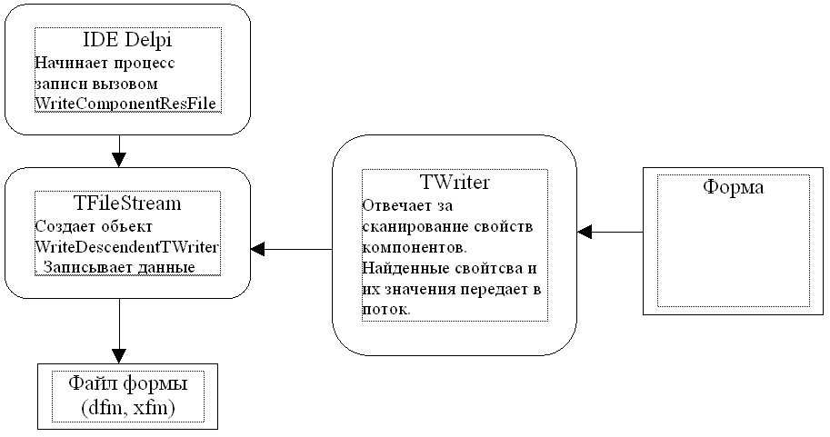 На рисунке 1 схематично изображен процесс сохранения свойств формы в файл. Все начинается с того, что IDE Delphi вызывает метод WriteComponentResFile. Метод объявлен следующим образом: