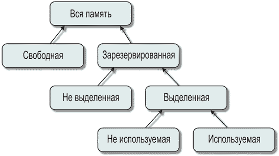 Прежде всего, условимся о смысле используемых терминов. Основная путаница возникает из-за того, что менеджер памяти Delphi сам использует услуги менеджера виртуальной памяти Windows. Блок памяти, свободный с точки зрения программы, может считаться выделенным с точки зрения Windows. Итак, фрагмент памяти будем называть свободным, если он целиком состоит из страниц свободной памяти в смысле Windows. Фрагмент памяти будем называть зарезервированным, если он целиком состоит из страниц памяти, зарезервированных приложением. Фрагмент памяти будем называть выделенным, если он состоит целиком из страниц памяти, под которые выделена физическая память. Соответственно, фрагмент памяти будем называть не выделенным, если он состоит из страниц, зарезервированных приложением, но под которые не выделено физической памяти. Фрагмент памяти будем называть используемым, если он был передан Delphi-программе. И, наконец, фрагмент памяти будем называть неиспользуемым, если под ним расположена физическая память, но в настоящее время он не используется приложением Delphi. Вся иерархия памяти представлена на рис. 1.
