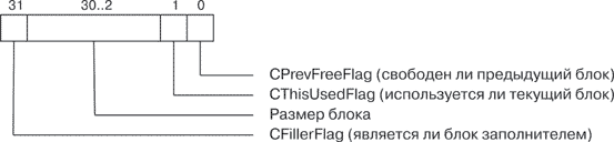 В выделенных фрагментах памяти блоки идут один за другим. Всего различают три типа блоков. Это используемые блоки, неиспользуемые блоки и заполнители. Администратор памяти оперирует с блоками, размеры которых выровнены по границе cAlign байт. Размер блока хранится в самом блоке памяти. Поскольку в настоящее время cAlign равен четырем, то, очевидно, два младших бита несущественны и могут использоваться как флаги. Третий флаг возникает при использовании самого старшего бита, что ограничивает размеры выделяемых блоков двумя гигабайтами. Формат размера приведен на рисунке 4.