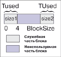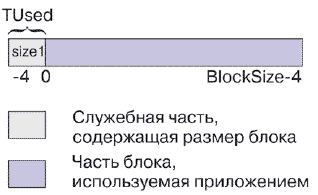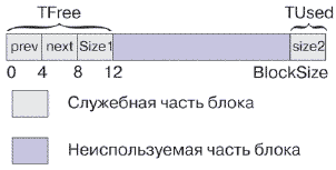 Служебная часть неиспользуемого блока памяти, расположенная в начале блока, описана в структуре TFree. Служебная часть неиспользуемого блока памяти, расположенная в конце блока, описана в структуре TUsed.