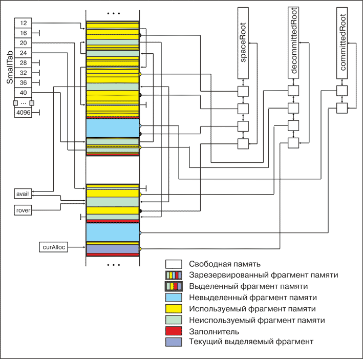 Массив указателей smallTab хранит указатели на двунаправленные списки, состоящие из неиспользуемых блоков небольшого размера. Наибольший размер, информация о котором хранится в этом массиве, равен cSmallSize байт, что в настоящее время составляет 4 Кб. Заметим также, что элементы массива smallTab являются только указателями на элементы двунаправленного кольцевого списка, но, в отличие от таких структур, как spaceRoot, decommittedRoot и committedRoot, не являются корневыми элементами. В случае, когда свободных элементов указанного размера нет, соответствующий указатель в массиве smallTab равен nil. В качестве связей в двунаправленном списке используются поля prev и next структуры TFree в начале неиспользуемого блока. Место под массив smallTab выделяется в локальной куче процесса. Первоначально все указатели содержат значения nil.