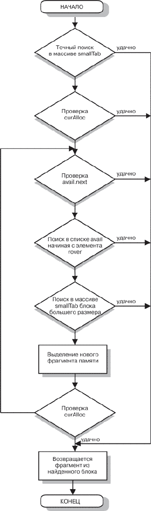 Алгоритм выделения памяти достаточно прост – в цикле перебираются все списки в порядке приоритета, и если находится нужный фрагмент, то его и возвращают программе. Схема алгоритма выделения памяти приведена на рисунке 9. Ниже мы приведем описание всех попыток, в том порядке, в котором они производятся.