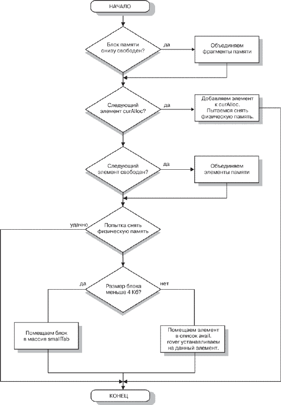 Алгоритм освобождения памяти уже не является линейным, как алгоритм выделения памяти. Однако он также не представляет большой сложности, поскольку большинство развилок связано с объединением смежных свободных блоков. Алгоритм приведен на рисунке 10.