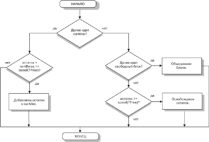 В случае уменьшения размера блока обратим внимание на необходимость следить за тем, чтобы не образовывались неиспользуемые фрагменты памяти размера, меньшего, чем sizeof(TFree) байт. Поэтому в подобной ситуации размер блока сохраняется прежним.