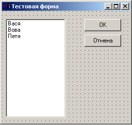 В качестве примера создадим простейшую DLL с формой. Для этого в IDE выберем пункт File / New/Other, а в появившемся диалоге – пункт меню “DLL Wizard”. Сохраним модуль под именем FormDLL. В заготовку библиотеки добавим форму, которую затем и будем отображать в различных приложениях (File/New/Form). На форме расположим ListBox, заполнив его тремя значениями, и две кнопки – «OK» и «Отмена». Свойство формы BorderStyle установим в bsDialog, а свойство кнопок ModalResult – в mrOk и mrCancel, соответственно. Внешний вид формы приведен ниже.