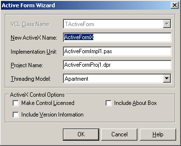 Что ж, начнем – File/New/Other. В появившемся диалоге перейдем на закладку ActiveX и выберем элемент ActiveXForm. На экране появится диалог установки параметров