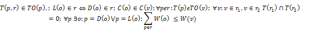 Здесь p – географическая точка, TO – временной интервал ее работы, o – задание на доставку, характеризуемое параметрами L(o) – точкой загрузки, D(o) – точкой назначения, C(o) – категорией груза, W(o) – массогабаритными характеристиками груза. Значение функции T(p, r) показывает момент посещения точки p при выполнении рейса r. Под v понимается одно из доступных транспортных средств характеризуемое параметрами C(v) – категория транспортного средства, TO(v) – расписание работы транспортного средства, W(v) – вместимость транспортного средства по весу и объему. Под принадлежностью транспортного средства рейсу понимается факт обслуживания данным транспортным средством данного рейса.