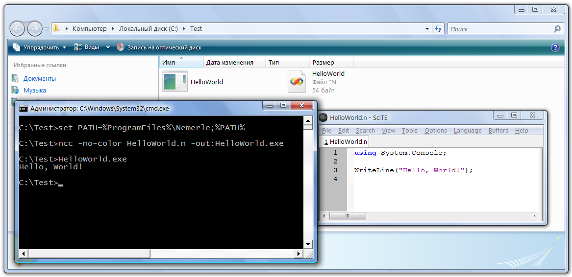 Там же находятся библиотеки, относящиеся к «Интеграции с Microsoft VS» и библиотеке времени выполнения Nemerle.dll, которая требуется для запуска программ, получаемых с помощью компилятора Nemerle. Для упрощения использования ncc добавьте путь %ProgramFiles%\Nemerle в переменную среды окружения PATH (о том, как это сделать, см. здесь). Тогда вы сможете вызывать ncc из любого каталога на вашей машине.