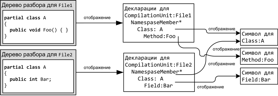 Ниже приведен пример, демонстрирующий отображение двух partial-классов C# в соответствующие декларации и отображение деклараций в символы.