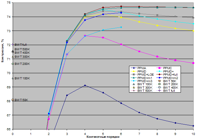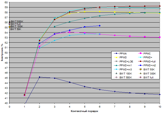 Ближайшим лучшим кодеком на базе алгоритма РРМ для теста ACT GRAPHICS является PPMD+full o10 с результатом 3.156 (60.548%), что ненамного хуже, чем BWT full.