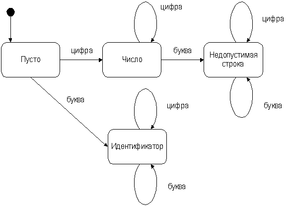 Для удобства рассмотрим простой пример, который будет использоваться далее. Допустим, что необходимо определить, является ли входная последовательность символов целым числом, допустимым идентификатором, или недопустимой строкой. Под допустимыми идентификаторами будем понимать такие идентификаторы, которые начинаются с буквы и далее содержат буквы и "/", или цифры. Автомат, который поможет решить задачу, показан на рисунке 1. На рисунке используется нотация UML (Unified Modeling Language).