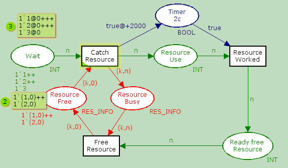 В рассматриваемом примере при первой итерации две фишки, отражающие выполнение процесса, переместятся в состояние ResourceUse, две фишки появятся в позиции Timer2c, и две фишки, представляющие ресурс – в позиции ResourceBusy, изменяя при этом элемент цвета, указывающий номер процесса, захватившего ресурс. После этого переход CatchResource сработать не сможет, так как нет фишки в позиции ResourceFree (свободного ресурса). Не разрешен также переход ResourceWorked (РесурсВРаботе), из-за того, что фишка, имитирующая таймер, несет временной штамп, равный 2000, а текущее значение глобальных часов равно 0. Если установлено, что нет доступных переходов, происходит наращивание счетчика глобальных часов до тех пор, пока не ''откроется'' переход ResourceWorked, так как штамп фишки в позиции Timer2c окажется равен значению глобальных часов. В результате начнется освобождение ресурсов, посредством срабатывания перехода ResourceWorked, отвечающего за условие временной задержки, и перехода FreeResource, осуществляющего имитацию освобождения ресурса путем проведения операции сравнения для идентификации фишки ресурса, несущей номер процесса, который использует данный ресурс. Таким образом, позиция ResourceFree приобретает две фишки и переход CatchResource активизируется, перемещая следующую фишку процесса на позицию ResourceUse. После наращивания часов до значения 4000 (порождаемая переходом CatchResource фишка таймера будет нести штамп текущего времени, равный 2000) станут последовательно доступны переходы ResourceWorked и FreeResource. Дальнейшая работа сети прекращается, так как не остается фишек в позиции Wait.
