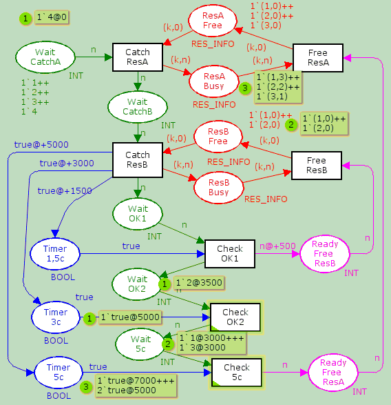 На рисунке 1 представлена РСП, отражающая процесс захвата-освобождения разделяемого ресурса множеством однотипных процессов. Выделенный переход является активным для текущей итерации выполнения РСП. Состояние системы включает в себя состояния ресурса, процесса и таймера. Состояния ResourceFree (РесурсСвободен) и ResourceBusy (РесурсЗанят) имеют цвет, состоящий из пары (k,n) (НомерРесурса, НомерПроцессаЗахватившегоРесурс). Вторая переменная необходима для последующей идентификации ресурса при его освобождении. Состояния процесса Wait (Ожидание), ResourceUse (РесурсИспользуется) и ReadyFreeResource (ГотовОсвободитьРесурс) имеют цвет типа Integer, содержащий номер текущего рабочего процесса (может идентифицировать, например, физический объект). Состояние Timer2c (ТаймерНа2с) типа Boolean служит для моделирования задержки, принимая от перехода CatchResource (ЗахватРесурса) фишку с временным штампом. В соответствии с позициями (состояниями), фишки имеют свой цвет, отражая текущее состояние системы. На диаграмме компоненты цветов фишек представлены в прямоугольнике в непосредственной близости от позиций, в кружочке показано их общее число у данной позиции. Блок объявления множеств цветов и переменных выглядит следующим образом: