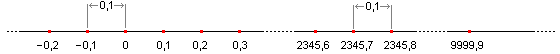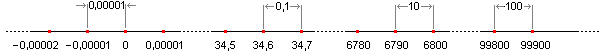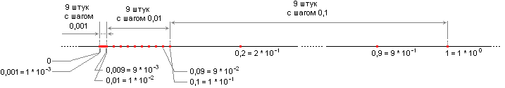 У чисел с плавающей запятой картина совершенно иная. На рисунке 3 кусочек числовой прямой изображён в «истинном» масштабе (формат немного игрушечный: мантисса 1 десятичный знак, показатель степени от -3 до +4).