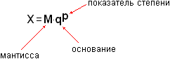 | ПРИМЕЧАНИЕ Пара слов про термины: * Мантиссу англичане называют по-разному: significand, mantissa, fraction (точнее, fraction это дробная часть – не совсем мантисса, но близко). По-русски – только мантисса. * Показатель степени по-английски будет exponent. Русских варианта три: собственно «показатель степени», порядок, экспонента. |
