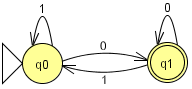 Конечные автоматы удобно изображать графически. На рисунке 1 приведён несложный ДКА, допускающий цепочки из 0 и 1, заканчивающиеся символом 0. Начальное состояние помечено входящей в него стрелочкой (да, этот здоровенный треугольник в душе – стрелочка), допускающее (в данном случае оно одно) – двойным кружком.