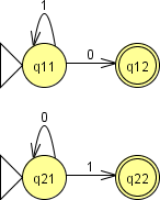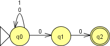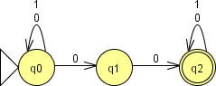 На рисунке 2 изображён простой НКА, допускающий цепочки из 0 и 1, заканчивающиеся на 00.