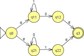 | ПРИМЕЧАНИЕ В замечательной программе JFLAP, скриншоты из которой используются в качестве рисунков, ε-переходы почему-то обозначаются символом λ, но я нашёл в себе силы поправить картинки. |