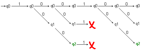 Наименее формальный подход к описанию работы НКА основан на том, что он «угадывает». Вернёмся к автомату на рисунке 2 и цепочке «100100».