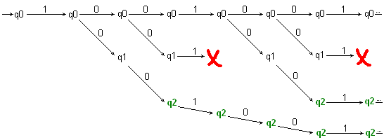 В данном случае мы несколько удаляемся от определения НКА (множества состояний не представлены так явно). Картинка основана на следующей идее: каждый раз, когда по входному символу возможен переход в несколько состояний, порождается новая ветка вычислений, когда переходов нет – ветка «засыхает». Если хоть одна из «живых» веток ведёт в допускающее состояние – цепочка допущена.