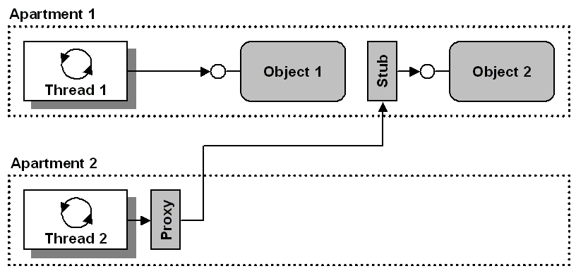 Рис.1 показывает отношения между потоками и объектами, находящимися в одном и том же подразделении, и потоками и объектами, которые были назначены в разные подразделения. Вызовы из потока 1 идут напрямую к созданному объекту. Вызовы из потока 2 идут через представителя и заглушку (proxy-stub). COM создает пару представитель-заглушка когда маршалит указатель на интерфейс из подразделения потока 2. Как правило, указатель на интерфейс должен быть отмаршален, когда пересекает границы подразделения. Это означает, что когда вызываются обычные интерфейсы, используется та же самая DLL с представителем-заглушкой (или библиотека типов (type library) если вы предпочитаете маршалинг через библиотеку типов) что используется для маршалинга вызовов между процессами и компьютерами, даже и для внутрипроцессных объектов, если они должны общаться с клиентами из других подразделений.