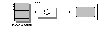 Один из тонких моментов STA состоит в том, как COM перемещает вызовы для STA-шных объектов в STA-шный поток. Когда создается STA, COM одновременно создает невидимое окно для этого подразделения. Оконная процедура (windowproc) этого окна знает как обрабатывать специальные сообщения представляющие вызовы методов. Когда вызов метода, предназначенный для STA появляется из COM-ового RPC канала, COM посылает сообщение представляющее этот вызов STA-шному окну. Когда поток в STA получает это сообщение он отправляет его невидимому окну и оконная процедура этого окна передает этот вызов в заглушку. Заглушка, в свою очередь, выполняет прямой вызов объекта. Поскольку поток принимает, распределяет и обрабатывает только одно сообщение за раз, назначение объекту STA реализует грубый (но эффективный) механизм синхронизации вызовов. Как показано на Рисунке 2, если n вызовов были адресованы STA-шному объекту одновременно - параллельно, то все эти вызовы будут поставлены в очередь и достигнут объекта по одному за раз - последовательно.