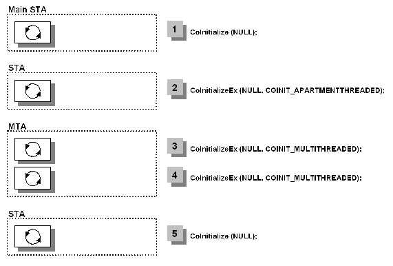 ::CoInitializeEx(NULL, COINIT_APARTMENTTHREADED); // Thread 2 ::CoInitializeEx(NULL, COINIT_MULTITHREADED); // Thread 3 ::CoInitializeEx(NULL, COINIT_MULTITHREADED); // Thread 4 ::CoInitialize(NULL); // Thread 5 |