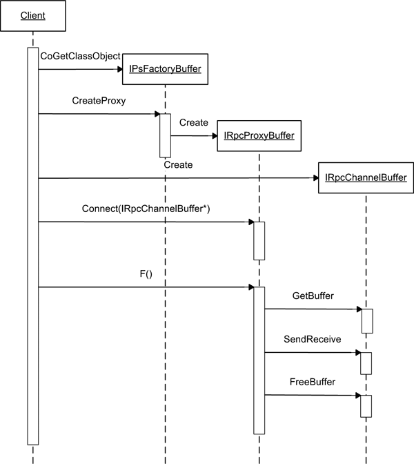 Механика передачи вызова между контекстами/апартаментами/процессами/машинами и связи со Stub-ом полностью определяется реализацией канала IRpcChannelBuffer. Типичная последовательность вызовов между участвующими в процессе маршалинга компонентами показана на рисунках 1 и 2.